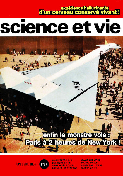 octobre 1964 – 180 pages• Courrier des lecteurs • Il y a 50 ans dans La Science et la Vie • Science-Flash actualités • Fred Hoyle : une nouvelle théorie de l’Univers • Champagnole : les derricks du salut • Nouvelle offensive contre la sciatique • L’hallucinante expérience d’un cerveau conservé vivant • À Brétigny, les volontaires de la mort sont des équations • Au cœur d’Anvers, le zoo de la liberté • Nous ne voyons pas les couleurs comme elles sont • Le rayon laser, outil universel de demain • Premier « docteur ès sciences appliquées » • Jeux et paradoxes : Tout est dans tout • Les dessous de l’affaire Bull ou le triomphe des géants • Six milliards d’AF pour gagner 14 km/h • Les télescopes de l’espace • Le BX-70 : 63 mètres de long, 3 000 km/heure • Premier vol électrique par propulsion ionique • De fausses mains qui obéissent à la pensée • Trois prix Nobel veulent « européaniser » les recherches sur les secrets de la vie • 500 millions d’illettrés dans le monde • Contre les embardées : le frein autostable • Auto : une simple courroie remplace tout un train de pignons • Le « rétromètre », téléphone à lumière • Bancs d’essais : – Trois stylos s’affrontent sur 10 000 mètres – Photo : Le Gevalux 144 • Les livres du mois
