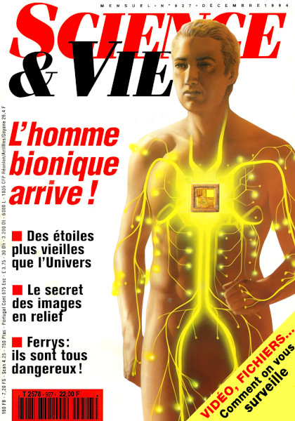 décembre 1994 – 184 pages• L’évènement : Le CNRS à l’heure russe • Recherche • Environnement • HUBBLE : Des étoiles trop vieilles dans un Univers trop jeune • MIROIRS PARFAITS : Les trous qui réfléchissent • DÉBAT : Biologie moléculaire contre… sciences naturelles • INDIENS : Peuplement des Amériques : c’est la guerre • CONTRE LE DIABÈTE : Des billes dans l’abdomen • EN COUVERTURE : L’homme bionique arrive ! • Technologie • NANOMATÉRIAUX : Des poussières titanesques • DISSUASION : La solution non nucléaire • MARINE MILITAIRE : Un concept révolutionnaire, le Frappeur • FERRYS : Ils sont tous dangereux • PUCES, FICHIERS ET VIDÉO : Comment on vous surveille • TROISIÈME ŒIL : Le secret des stéréogrammes • ÉLECTRICITÉ : Pourquoi sommes-nous si mal éclairés ? • Quotidien • Médiathèque • Agenda • Comment ça marche : La centrifugeuse • Électronique amusante : Une sentinelle pour votre chaîne hi-fi • Informatique amusante : Molécules en relief • Biologie amusante : Quand l’électricité se fait aide de laboratoire • Le journal de l’astronome : Une lunette à tout faire • Échecs & maths : La faute de l’écolier & L’heure de la récréation • Forum • 3615 SCV • Science & Vie il y a… |
