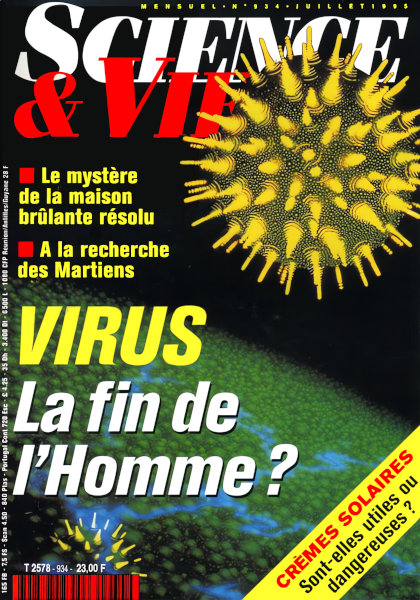 juillet 1995 – 172 pages• L’évènement : Feu : il y a 400 000 ans, déjà… • Recherche • Environnement • REPÈRES : Plutonium, le cycle infernal • DOSSIER VIRUS : La fin de l’Homme ? – L’invasion des mutants – L’explosion des fièvres hémorragiques – La stratégie du parasite tueur • VIE EXTRATERRESTRE : Où sont passés les Martiens ? • CATASTROPHE : Adoptez un bébé trou noir • SUPERCORDES : Réconcilier Einstein et la mécanique quantique • HIÉROGLYPHES : Déchiffrez l’écriture maya • MAISON BRÛLANTE : Un gigantesque court-circuit • MALVOYANTS : Réapprendre à voir • CAHIER PHOTOS : Plongée en mer Rouge • DIRIGEABLES : Le retour des plus légers que l’air • Technologie • ÉCLAIREUR : Le robot à tout faire • VILLE : Feu vert pour la voiture électrique • COSMÉTIQUES : Les crèmes solaires sont-elles utiles ou dangereuses ? • Quotidien • Médiathèque • Agenda • Comment ça marche : La lévitation magnétique • Électronique amusante : Un modulateur psychédélique pour voiture • Informatique amusante : Jouons avec les heures • Biologie amusante : L’acidité de la vie • Le journal de l’astronome : Le ciel de vos vacances • Échecs & maths : Les lois de la dynamique & Jouez à saute-jetons • Forum • Science & Vie il y a… |