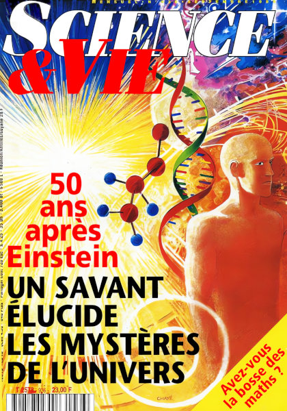 septembre 1995 – 164 pages• L’évènement : Science & Vie vers le XXIe siècle ACTUALITÉ • Recherche • Environnement • Technologie • Médecine • BALISE : Marées, un phénomène lunatique • ENQUÊTE : Énigme au fond du labyrinthe • EN COUVERTURE : 50 ans après Einstein, un savant élucide les mystères de l’Univers • CERVEAU : Avez-vous « la bosse des maths » ? • DOSSIER : L’espionnage spatial – HÉLIOS : L’œil de l’Europe dans le ciel – CAHIER PHOTOS : Big Brother vous regarde – Les sentinelles de l’espace • MÉDECINE : Le gène de tous les cancers • SANTÉ : La fin de l’obésité ? • MUSÉOLOGIE : Les chefs-d’œuvre dans l’accélérateur • NAVIGATION : Quand la Chine dominait les mers • HISTOIRES : Röntgen offre au monde les rayons X • AUTOMOBILE : La valse à deux temps • TRANSPORTS : Les traversées de Paris RENDEZ-VOUS • Quotidien : Cyclistes, rechargez vos batteries • Expérience : Des enzymes à tout faire • Énigme : Un angle droit = un angle obtus • Astronomie : Les lunes d’automne • Rétro : Il y a 75 ans • Invention : Brunissez vos couverts • Forum : Les pesticides sont à nos portes • Médiathèque : La « Préhistoire » rééditée • Cyberscope : Internet, les bonnes adresses FUTURS • Dans le monde de la communication, on ne se rencontre plus • Jeux vidéo : les vertiges du virtuel • C’est déjà demain… |
