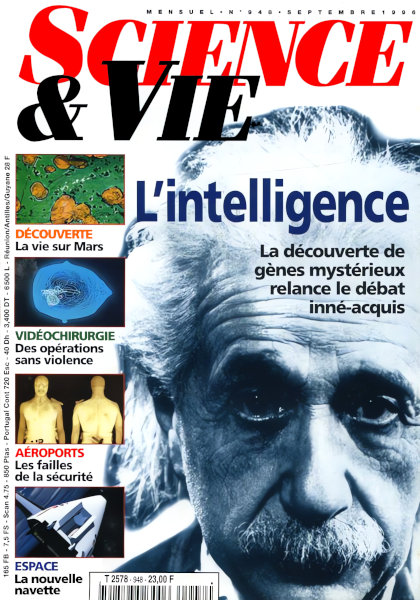 septembre 1996 – 164 pages• L’évènement : La malédiction de la vache folle ACTUALITÉ • Recherche • Environnement • Technologie • Médecine • BALISE : Le temps des vendanges • FOCUS : Les aéroports sous la menace • EXOBIOLOGIE : La belle vie sur Mars • COSMOLOGIE : Qu’y avait-il avant le Big Bang ? • SISMOLOGIE : La Haute-Savoie en tremble encore • EN COUVERTURE : L’intelligence : La découverte de gènes mystérieux relance le débat inné–acquis • CAHIER PHOTOS : Fleurs : les gènes de la beauté • SOCIÉTÉ : « La science est en danger » • ORNITHOLOGIE : Comment le chant vient aux oiseaux • POLÉMIQUE : Les raisins de la caulerpe • CHIRURGIE : Des opérations sans violence • ENQUÊTE : Faut-il avoir peur des plombages ? • HISTOIRES : Yves Rocard, le « sourcier » de la science • ESPACE : – Un avion en orbite ! – Des fusées à la mer • CONSOMMATION : La photo numérique est un peu floue • ÉCLAIRAGE : La lumière à bon marché RENDEZ-VOUS • Quotidien : Photo : un monstre de technologie • Astronomie : Lune : la deuxième disparition • L’expérience : Les enzymes jouent avec les molécules • Échecs : La Voie lactée • Rétro : Il y a 60 ans • Forum : Folle ou pas, que mange la vache ? • Médiathèque : Ces bons vieux fossiles • Internet : La rentrée du Web FUTURS • La communication entre le bien et le mal • Télétravail : une révolution en marche • C’est déjà demain ! |