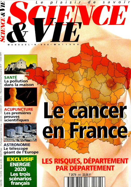 mai 1998 – 184 pages• L’évènement : Ce que l’ADN ne peut pas dire • Forum ACTUALITÉ • Recherche • Environnement • Technologie • Médecine • FOCUS : Agriculture : les oubliés de la lutte antipollution • ASTRONOMIE : Les trous noirs sortent de l’ombre • VLT : l’Europe a son géant • SANTÉ : Dioxines : un dossier encombrant • REPORTAGE : Tataouine, le sanctuaire des dinosaires • CAHIER PHOTOS : Villes au microscope • DOSSIER : Le cancer en France – L’inégalité devant le cancer – Les étapes du développement de la maladie – Une multiplicité de causes – Dépistage et prévention : les parents pauvres – L’arsenal thérapeutique • MÉDECINE : Les premières preuves scientifiques de l’acupuncture • HISTOIRES : Einstein accusé de plagiat ! • RÉTRO : Il y a 60 ans • ÉCONOMIE : L’euro va-t-il sauver l’Europe ? • TÉLÉCOMMUNICATIONS : L’invasion des satellites • DÉVELOPPEMENT : Le tiers-monde teste la radio numérique • POLLUTION : L’ennemi dans la maison SÉLECTION • High-tech • Livres • CD-Rom • Astronomie • Internet FUTURS • Énergie 2020 : les trois scénarios français • C’est déjà demain ! |