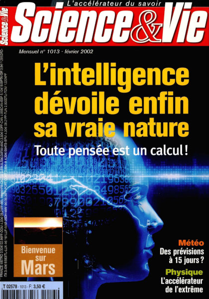 février 2002 – 164 pages• L’évènement : Il n’est pas passé loin ! • Forum ACTUALITÉ • Recherche • Environnement • Technologie • Médecine • EN COUVERTURE : La vraie nature de l’intelligence – Toute pensée est un calcul – Au-delà des mathématiques – L’informatique sauvée des bugs • EN IMAGES : Bienvenue sur Mars • MÉTÉOROLOGIE : Les prévisions météo sortent du brouillard • NEUROSCIENCES : Cette femme est une menteuse • NEUROPSYCHOLOGIE : Les jeux vidéo rendent-ils intelligents ? • DOSSIER : LHC : l’accélérateur de l’extrême – Les défis d’un fabuleux chantier – Un outil unique au monde – 800 millions de collisions par seconde ! • ENVIRONNEMENT : Farines animales : comment s’en débarrasser • MÉDECINE : Dix ans pour vaincre l’arthrose • SANTÉ : Alerte au poison des poissons • FOCUS : Les trous noirs en questions • ÉNERGIE : Les arbres prennent la relève du pétrole • INFORMATIQUE : La micro s’empare du papier et du stylo SCIENCE NET • Habillé sur mesure en dix secondes INTERNET • Le cerveau artificiel en pleine réflexion CONSO • Textos : les petits messages en grand format LOISIRS • Le ciel du mois • CD-Rom • Livres • HISTOIRE : Gay-Lussac, un homme en quête de lois • RÉTRO : Il y a 75 ans • Index des numéros 1000 à 1011 pour l’année 2001 |