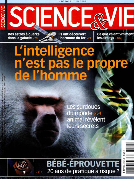 juin 2002 – 184 pages• Avant-propos : L’âge de raison des bébés-éprouvette ACTUALITÉS • RECHERCHE : • C’est la rétine qui commande nos rythmes biologiques • La physique s’attaque aux palimpsestes • Une ancienne fresque était enterrée sous la pyramide… • SANTÉ & MÉDECINE : • Une valve cardiaque posée sans opération chirurgicale • Les poussières affectent la croissance des poumons… • ENVIRONNEMENT & CADRE DE VIE : • Les fourmis envahissent l’Europe du Sud • Paris se dote d’un chauffage propre… DÉCODAGE • [À LA UNE] : L’intelligence n’est pas le propre de l’homme • EN PROGRÈS • Des astres à quarks dans la galaxie • Ils ont découvert l’hormone du fer • OGM : la deuxième génération arrive • Cancer du côlon : les nouvelles armes du dépistage • EN PRATIQUE • Quand les réformes démocratiques butent sur des lois physiques • 1 étudiant sur 5 se dope • Ce que valent vraiment les airbags • CASSE-TÊTE • Et si la Terre perdait le nord • Bébé éprouvette : des naissances à risque ? REPÈRES • Le point sur… L’eau en France – Contexte : « Un patrimoine qu’il faut protéger » – Juridique : Une ressource encore trop mal connue – Faits et Chiffres : pollution, prix… toutes les données – Stratégie : Les remèdes pour sauver l’eau – Économie : Des prix trop bien gardés • QUESTIONS & RÉPONSES • Comment mesure-t-on l’âge de l’Univers ? • Le ciel du mois • HISTOIRE : Alcide d’Orbigny : celui qui fut le grand rival de Darwin • COMMENT ÇA MARCHE : Le scanner à bagages • ILS L’ONT FAIT : Le zoom vertical qui ne sort pas du boîtier • IL Y A… 30 ans EXPLORATION • La filière chinoise des os de dinosaures • L’immortelle Ânkhesenpépy II |