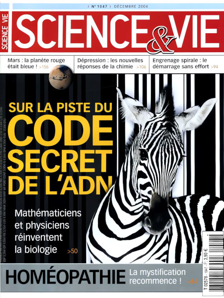 décembre 2004 – 192 pages• Avant-propos : ADN, le blues de la cinquantaine ACTUALITÉS • RECHERCHE : • Le carbone pourrait supplanter le silicium dans l’électronique • Calculer est possible sans l’aide des mots • SANTÉ & MÉDECINE : • Une étude met en cause les suppléments vitaminés • La guerre aux sucres cachés dans les aliments est lancée • ENVIRONNEMENT & CADRE DE VIE : • Des félins errent outre-Manche • La pollution à l’azote a été cartographiée • SpaceShipOne a remporté son pari • HOMMAGE : « Cher Franquin… » DÉCODAGE • [À LA UNE] : Code secret de l’ADN • EN PROGRÈS • La danse de Mercure enfin élucidée • Les animaux aussi évoluent culturellement • EN PRATIQUE • Homéopathie : la mystification continue • Le démarrage en moins d’un quart de tour • CASSE-TÊTE : Vagues scélérates REPÈRES • Le point sur… La dépression – Contexte : Une « maladie » qui dérange – Diagnostic : À partir de quand être malheureux n’est plus normal ? – Faits & chiffres : Deux fois plus de femmes touchées – Mécanisme : La faute aux conditions de vie ? – Traitements : Guérir par la chimie ou par la parole ? – Recherche : Vers d’autres remèdes… • QUESTIONS-RÉPONSES • Qu’est-ce qu’une pierre ? • Pourquoi y a-t-il des animaux à sang froid ? • D’où vient que la neige est blanche ? • Le ciel du mois • COMMENT ÇA MARCHE : Le stimulateur cardiaque • ILS L’ONT FAIT : Spécial Noël : le meilleur de la high-tech • Le beau son chez soi • Le numérique dans tous ses états • Le téléphone au goût multimédia • L’informatique tout interactive • L’électronique au cœur des jeux • L’électricité à fond les manettes • IL Y A… 75 ans EXPLORATION • Mars : la planète rouge était bleue ! |