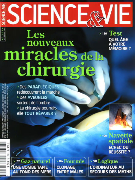 septembre 2005 – 156 pages• Avant-propos : Chirurgie : l’indéfectible goût de l’exploit • FORUM : Réactions, critiques, remarques… nos lecteurs prennent la plume • ON EN REPARLE : Nous en avions parlé, ils font de nouveau l’actualité • ILS L’ONT FAIT : Retour en image sur les derniers événements scientifiques ACTUALITÉS • EN DIRECT DES LABOS : Le cœur de la Terre va livrer ses secrets – au départ, l’éléphant était menu – etc. • PLANÈTE TERRE : La carte de la biodiversité – des oiseaux de mer sont dévorés par des souris devenues carnivores – etc. • SANTÉ : Un vaccin contre le cancer du col de l’utérus – le chocolat est bon pour les artères – etc. • L’AGENDA DES SCIENCES : Tous les grands rendez-vous scientifiques de septembre • LES CLÉS POUR COMPRENDRE : Le réacteur expérimental à fusion nucléaire Iter sera bien construit en France À LA UNE : Chirurgiens de l’extrême FONDAMENTAL • PLANÉTOLOGIE : Des mondes inconnus gravitent autour de Saturne • GAZ NATUREL : Une bombe climatique tapie au fond des mers ? • VITAMINE A : Elle nous rend symétriques • FOURMIS DE FEU : La guerre des sexes est déclarée • MATHÉMATIQUES : L’ordinateur aura bientôt le dernier mot • SILICIUM : Vers la révolution des panneaux solaires EXPLORATIONS • RÉTROSPECTIVE : Les années navette • RENCONTRES : Les enfants de la génération fractale EN PRATIQUE • À LIRE, À VOIR : Tout sur les livres, expositions, films, sites web, etc., de l’actualité des sciences. – Et toujours « le Ciel du mois » • Q & R : Allumer les phares fait-il consommer plus de carburant ? – Par quel processus les coraux forment-ils des récifs ? – Pourquoi ne faut-il pas recongeler un aliment décongelé ? – D’où viennent les cernes ?… • LE POINT SUR… le cahier électronique • TECHNOFOLIES : La télé TNT portable à écran plat – le labo photo de voyage • TEST : Quel âge a votre mémoire ? |