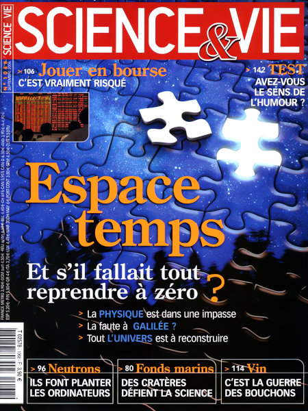 septembre 2006 – 148 pages• Avant-propos : Un puzzle presque parfait • FORUM : Réactions, critiques, remarques… nos lecteurs prennent la plume • ILS L’ONT FAIT – Retour en image sur les derniers événements scientifiques ACTUALITÉS • EN DIRECT DES LABOS : Une molécule anti-âge a été découverte – Une orchidée parvient à s’autoféconder – etc. • PLANÈTE TERRE : L’avancée des déserts peut être évitée – Le réchauffement fait chuter les Alpes – etc. • SANTÉ : Des lymphocytes T sont nés de cellules souches – Le chlore des piscines favoriserait l’asthme – etc. • L’AGENDA DES SCIENCES : Les grands rendez-vous scientifiques du mois • LES CLÉS POUR COMPRENDRE : Le prix des matières premières s’envole À LA UNE : Espace-temps… FONDAMENTAL • PLANÈTES GÉANTES : Un modèle révolutionnaire explique enfin pourquoi elles n’ont que de petits satellites • FONDS MARINS : Un immense champ de cratères intrigue les géologues • ASYMÉTRIE : On sait enfin pourquoi notre cœur bat à gauche… • THÉRAPIE GÉNIQUE : Elle trouve un second souffle grâce à l’ARN interférent • RAYONS COSMIQUES : Venus du fin fond de l’Univers, des neutrons font boguer PC et téléphones • BIOCARBURANTS : Un nouveau procédé promet de doper les rendements EXPLORATIONS • ANALYSE : Le grand bluff des modèles financiers • ENQUÊTE : La guerre des bouchons EN PRATIQUE • À LIRE, À VOIR : Tout sur les livres, expositions, films, sites web, etc., de l’actualité des sciences. Et toujours « le Ciel du mois » • Q & R : Comment se fait-il qu’on ait des maux de tête ? – Quelle est la différence entre animal et végétal ? – Pourquoi est-ce que le savon mousse ? • LE POINT SUR… le réfrigérateur • TECHNOFOLIES : Le premier PC sans disque dur – Le GPS qui retrouve les lieux photographiés – etc. • TEST : Avez-vous le sens de l’humour ? |