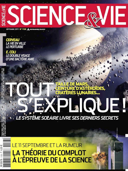 septembre 2011 – 148 pages• Avant-propos : Système Solaire – Escherichia coli – 11 Septembre • FORUM ACTUS • Labos : Un orage géant sévit sur Saturne – On a vu des neutrinos permuter – Pluton dévoile un satellite – Le filet de bulles de la baleine n’a plus de secret – Des bactéries restaurent les œuvres d’art – etc. • ON EN REPARLE : Anomalie Pioneer : l’effet thermique tient la corde • Terre : Il reste encore 7,5 millions d’espèces à découvrir – Le charbon est bon… pour le réchauffement – etc. • IDÉE NEUVE : « Je compte utiliser les câbles sous-marins pour surveiller le réchauffement » • Médecine : Des cellules nasales soignent une amnésie – Le scanner réduit la mortalité du cancer du poumon – etc. • FOCUS : Cerveau : vivre en ville perturbe son fonctionnement • ON TENAIT À VOUS LE DIRE : La pénurie de nouveaux antibiotiques n’est pas une fatalité • Technos : Les biocarburants ont franchi une étape décisive – etc. • LES CLÉS POUR COMPRENDRE : Pourquoi les horaires des trains vont changer FONDAMENTAL • À LA UNE : Le Système Solaire livre ses derniers secrets • PORTRAIT : E. coli, mon amie • DÉCOUVERTE : Ils ont réinventé le vélo • ANALYSE : Océans : ils sont menacés de toutes parts • REPORTAGE : Sang artificiel : Les cellules souches relancent l’espoir • LE POINT SUR… 10 ans après les attentats du World Trade Center… Le 11 Septembre et la rumeur EN PRATIQUE • BON À SAVOIR • ZOOM DU MOIS : Le sommeil en 16 questions • QUESTIONS / RÉPONSES : Le nombre d’élèves par classe a-t-il un effet sur les résultats scolaires ? – Pourquoi les feuilles sont-elles le plus souvent vertes ? – Peut-on souffrir d’une crampe au niveau du cœur ? – Quel est le rapport entre l’angoisse et la transpiration ? – Comment se mesure le champ magnétique des astres ? – Existe-t-il des peuples isolés sur la planète ? • TECHNOFOLIES : Une voiture électrique à batterie échangeable – Un traqueur de pollution intérieure – etc. • À FAIRE : Voir la Terre tourner… avec des pots de peinture • LE CIEL DU MOIS • Contre-sommaire |