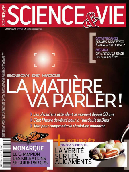 octobre 2011 – 156 pages• Avant-propos : L’heure du boson • FORUM ACTUS • Labos : Le cerveau se développe en élaguant ses synapses – Un incroyable carambolage cosmique a été reconstitué – etc. • ON EN REPARLE : Photos d’OVNIs : la plus célèbre était fausse • FOCUS : Papillon monarque : il est guidé par une boussole biologique • ON TENAIT À VOUS LE DIRE : Le mythe des canaux martiens a la vie dure • Terre : Les pays pauvres vont faire exploser la démographie – Le changement climatique a « dopé » cet épi – Hommes et bactéries libèrent moins de méthane – etc. • LES CLÉS POUR COMPRENDRE : Pourquoi la surpêche menace toujours en Europe • Médecine : La thérapie génique a pu soigner des leucémies – Le sida sera bientôt dépisté par une biopuce ! – etc. • IDÉE NEUVE : « Je propose de prévenir les accidents vasculaires à l’aide de champs magnétiques » • Technos : Ce patch est un épiderme électronique – etc. • FOCUS : Bioélectronique : des bactéries conduisent l’électricité ! FONDAMENTAL • À LA UNE : Boson de Higgs : la matière va enfin parler • DÉCOUVERTE : Archæopterix : il n’est plus l’ancêtre des oiseaux • ANALYSE : Catastrophes globales : sommes-nous prêts à affronter le pire ? • PORTRAIT : Après les bactéries… voici les nouveaux extrêmophiles • EXPLOIT : Vaccins : une nouvelle formule fait des miracles • CASSE-TÊTE : Lune : on ne sait plus comment elle est née ! • LE POINT SUR… 40 ans après le premier message électronique… la planète e-mail EN PRATIQUE • BON À SAVOIR • ZOOM DU MOIS : Alicaments : le dossier vérité • QUESTIONS / RÉPONSES : Est-il vrai que l’exploitation des gaz de schiste provoque parfois des séismes ? – Le nombre d’éléments chimiques est-il limité ? – Comment se fait-il que les maladies rares soient si nombreuses ? – Existe-t-il encore en France des forêts primaires ? – Pourquoi le crissement d’une craie nous crispe-t-il autant ? – D’où vient la poudre qui couvre les ailes des papillons ? • TECHNOFOLIES : La poubelle qui compacte les déchets – Des baskets entièrement biodégradables – etc. • À FAIRE : Mesurer la vitesse du son… avec un tuyau • LE CIEL DU MOIS • Contre-sommaire |