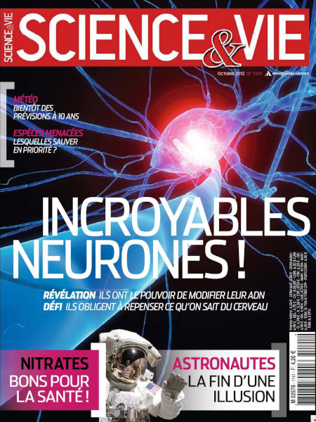 octobre 2012 – 148 pages• Avant-propos : La fin des débuts • FORUM ACTUS • Labos : L’espérance de vie se lit dans les gènes de la mère – etc. • LES CLÉS POUR COMPRENDRE : Astéroïdes : pourquoi prévoir leur impact sur Terre demeure impossible • IDÉE NEUVE : « Je recherche des sites archéologiques à l’aide des fractales » • Terre : L’océan piège toujours aussi bien le carbone – etc. • FOCUS : Pôle Nord : sa fonte est spectaculaire • Médecine : Le cerveau se débarrasse lui-même de ses déchets – Être frugal ne profite pas à tout le monde – La sensibilité à la lumière peut être restaurée – etc. • ON EN REPARLE : Cancer : les cellules souches sont bien coupables • Technos : Le diesel pourrait enfin être propre – Ce robot s’adapte à volonté – etc. • ON TENAIT À VOUS LE DIRE : Quel bluff, la voiture sans chauffeur ! FONDAMENTAL • À LA UNE : Incroyables neurones ! • DÉCRYPTAGE : Astronautes : la fin d’une illusion • EXPLOIT : La science des réseaux révèle les cartes du savoir • AVANT-PREMIÈRE : Prévoir le temps qu’il fera dans 10 ans n’est plus un rêve • ENQUÊTE : Nitrates : attention, ils sont bons pour la santé ! • CASSE-TÊTE : Le dilemme de Noé : mais quelles espèces menacées faut-il sauver ? • LE POINT SUR… 30 ans après le premier virus informatique… Les virus ont-ils gagné ? EN PRATIQUE • BON À SAVOIR • ZOOM DU MOIS : Cuire, refroidir, gélifier… Mettez de la science dans votre cuisine • QUESTIONS / RÉPONSES : Dois-je me faire vacciner contre la grippe passé 65 ans ? – Quel est le secret de l’efficacité du fer à vapeur ? – Pourquoi la peau est-elle le seul de nos organes à se régénérer ? – Comment les petits insectes survivent-ils à la pluie ? • TECHNOFOLIES : La petite voiture électrique parée pour durer – L’écran Oled de 55 pouces – Des socquettes en kevlar tout-terrain – Un vrai skate, sauf qu’il est électrique – Un casque clignotant pour les cyclistes – Un boîtier qui traduit la langue des signes – etc. • LE CIEL DU MOIS • Contre-sommaire |