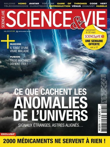 avril 2015 – 140 pages• Avant-propos : De surprise en surprise • ÉVÈNEMENT • FORUM ACTUS • Labos : L’homme a créé un organisme incapable de vivre sans lui – La diversité humaine pourrait s’enrichir de deux nouvelles espèces… • Environnement : La banquise ne cesse de s’étaler en Antarctique – Les termites freinent la désertification… • Médecine : Les maladies cardio-vasculaires ne connaissent plus de frontières – Des polluants accélèreraient la ménopause… • Technos : Un nouveau matériau sur lequel l’eau n’a aucune prise – L’exploration martienne se dote d’un drone éclaireur… SCIENCE & SOCIÉTÉ • RÉVÉLATIONS SUR LA 1RE LISTE DES MEILLEURS MÉDICAMENTS : Des milliers de médicaments ne servent à rien • SORTIE DE NOUVEAUX JEUX MULTIJOUEURS : Se créer un avatar modifie la personnalité des joueurs • RAPPORT SUR LES MÉTHODES D’INTERROGATOIRES DE LA CIA : La torture pousse à avouer n’importe quoi • UN CLIMATOSCEPTIQUE PAYÉ PAR UN LOBBY : Non, le réchauffement n’est pas dû au Soleil À LA UNE : Anomalies dans l’Univers • Signaux étranges, astres alignés… • Les 9 anomalies qui pourraient élucider l’Univers • À la recherche du meilleur des mondes SCIENCE & DÉCOUVERTES • BIOLOGIE CELLULAIRE : Cellules eucaryotes : l’hyopothèse que personne n’attendait • CLIMATOLOGIE : Les effets surprenants de l’homme sur le climat : quel chaos ! • NEUROBIOLOGIE : Suicide : il cache une vraie maladie SCIENCE & TECHNIQUES • FUSION NUCLÉAIRE : 3 machines défient Iter • CHASSE AU GASPI : Les lignes de code passent au code vert • BÉBÉ À 3 ADN : Plongée dans l’inconnu SCIENCE & FUTUR • Un dirigeable pourrait être envoyé sur Vénus – Les premiers plans de Paris transformé en poumon vert – Recycler le dégazage des bateaux est possible – Un projet de pistes cyclables souterraines à Londres – Une serre flottante autosuffisante est testée en Italie – En ville, des mini-éoliennes pourraient s’emboîter comme des Lego… CULTURE SCIENCE • BON À SAVOIR • QUESTIONS / RÉPONSES : Comment une plante peut percer le bitume ? – L’alcool détruit-il les neurones ? – Pourrait-on incinérer les déchets dans les volcans ?… • À VOIR / À LIRE : La réplique de la grotte Chauvet ouvre ses portes au public… • TECHNOFOLIES : Le premier drone à obéir à la voix – Le catamaran qui cache un scooter amphibie – Un mini-clavier pliable pour smartphone – Une batterie virtuelle… • IL Y A… 25 ans : Le lancement de Hubble, premier télescope spatial |