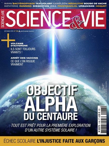 septembre 2016 – 128 pages• Avant-propos • FORUM ACTUS • Labos : Le cerveau adulte affiche un étonnant dynamisme – Mars aurait acquis ses lunes à la suite d’un choc géant – Pour séduire, le paon fait briller ses « yeux »… • Environnement : Depuis trente ans, la Terre verdit grâce aux émissions de CO2 – Un vrai modèle de gestion des coraux a été mis au point… • Médecine : Un vaccin cible à la fois la dengue et Zika – Une nouvelle écriture pour les malvoyants… • Technos : Une salamandre artificielle qui rampe, marche et nage – Un logiciel imprime des cheveux en 3D… ÉVÈNEMENT • ÉCHEC SCOLAIRE : L’injustice faite aux garçons À LA UNE • Objectif : Alpha du Centaure ! • 12 défis pour réaliser l’exploit • Une occasion de rejouer Apollo ? SCIENCE & DÉCOUVERTES • ÉVOLUTION : Plumes, poils, écailles… : une même origine • BIOLOGIE : Pollution lumineuse : les lumières de la ville sèment la pagaille chez les arbres • GÉOLOGIE : Volcans d’Auvergne : ils sont bien vivants • ENVIRONNEMENT : Microplastiques : l’invasion SCIENCE & TECHNIQUES • DIPHTÉRIE, TÉTANOS, POLIO : Et si on arrêtait de se vacciner • ATTENTATS : Un médicalment pour aider à oublier • BIOCARBURANTS : Les chiffres qui accablent SCIENCE & FUTUR • L’urbanisme prend pour modèle le millefeuille – Des ordinateurs se recyclent dans des bidons – Des villages qui visent l’autosuffisance énergétique et alimentaire – Un ciment luminescent éclaire la route de nuit – Un vaisseau monoplace facilitera les sorties dans l’espace – Un récif corallien imprimé régénère la faune et la flore – Bientôt, les taxis voleront au-dessus de l’eau… LA SCIENCE & LA VIE • Science & société • SUCCÈS DU RUNNING : Nous sommes nés pour courir • ARGENT ET ESPÉRANCE DE VIE : Gagner au loto ne fait pas vivre en meilleure santé • FIN DE LA DISSECTION À L’ÉCOLE : Une confrontation avec le réel irremplaçable • INÉGALITÉS DE SANTÉ : Plus de 7 % des Français sont à plus de 7 minutes d’un médecin • Science & vie pratique • BON À SAVOIR • TECHNOFOLIES : Une oreillette qui abolit la barrière des langues – La balance qui surveille aussi votre santé cardiaque – Un gant pour traduire les gestes en musique – Un siège auto ultraléger et ultrasolide… • Science & culture • QUESTIONS / RÉPONSES : Pourquoi les chevaux ont-ils besoin de fers ? – Comment le corps produit-il sa chaleur ? Quel est le bruit maximal possible ? • À VOIR / À LIRE • IL Y A… 170 ans : Johann Gottfried Galle découvre la planète Neptune |