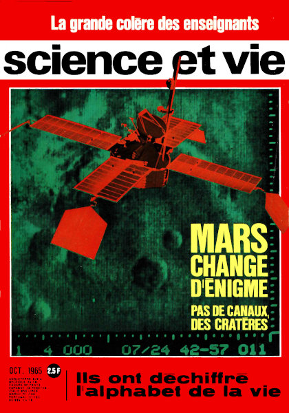 octobre 1965 – 180 pages• Courrier des lecteurs • Il y a 50 ans dans La Science et la Vie • Science-Flash • Éditorial : L’enseignement de la meilleure chance • Mars : le rapport de Mariner IV • Le professeur Delgado, torero presse-boutons • 500 000 cobayes entrent en sixième • L’homme détient enfin les clés de la vie • 70 ans après Kipling, une visite au pays des Gonds • Un pain de poudre met la France au 3e rang des puissances spatiales • Le Japon, nouveau Grand de la mer • Votre écriture peut révéler votre maladie • La cité de l’ordinateur • L’étrange musée des contrefaçons • DMSO : une panacée pour tous les maux ? • Jeux et paradoxes : Sachez peser ! • L’électronique au secours de notre cheptel • Les fusées, armes efficaces contre la grêle • Bancs d’essais : – Les bandes adhésives savent-elles vieillir ? – Photo : le Focasport au banc d’essai • Le général Ferrié, pionnier de la T.S.F. • Les livres du mois