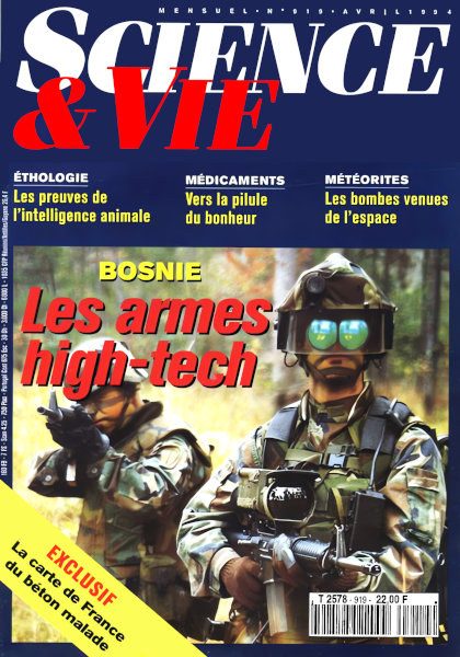 avril 1994 – 164 pages• L’évènement du mois : Superphénix ? Non, vache sacrée… • Forum • Échos de la recherche • Échos de l’environnement • ARMEMENTS : Bosnie : les limites de la technologie • ASTRONOMIE : Météorites : les Américains lèvent le secret • PHYSIQUE : Le piège se referme sur la masse • CHIMIE : Les atomes sans nom • ÉVOLUTION : Quand les baleines avaient des pattes DOSSIER ÉTHOLOGIE : INTELLIGENCE ANIMALE, LES NOUVELLES PREUVES • L’instinct, cache-sexe de l’intelligence • Homme et animal, mêmes capacités mentales • Le langage rend intelligent
