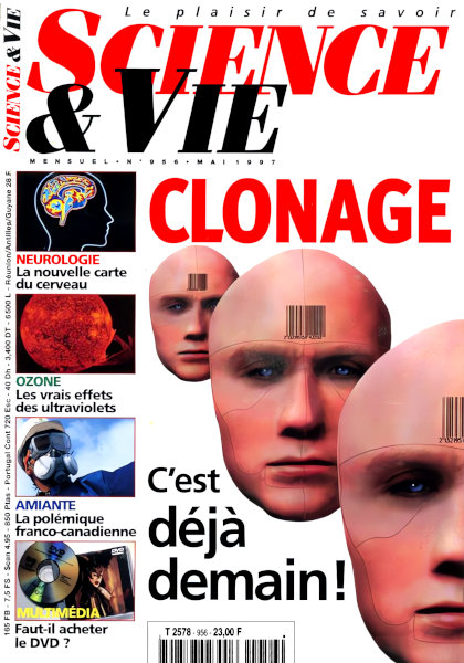 mai 1997 – 172 pages• L’évènement : Boeing TWA : à qui profite la polémique ? • Forum ACTUALITÉ • Recherche • Environnement • Technologie • Médecine • FOCUS : Amiante : et si la France se trompait ? • ASTROPHYSIQUE : Où est passée la lumière ? • MÉDECINE : Un prix Nobel de… radiologie • Trou d’ozone : la catastrophe est déprogrammée • SANTÉ : L’énigmatique pilule du Kremlin • Le cimetière des dinosaures • Le cerveau revisité • NEUROLOGIE : Parkinson : vers de nouveaux remèdes • EN COUVERTURE : Clonage, c’est déjà demain ! – Un siècle de manipulations – Le pactole des biotechnologies – La damnation du clone – Le meilleur des mondes • CAHIER PHOTOS : Sueurs froides en Bretagne • PHYSIOLOGIE : Le parfum de l’animalité • La nature contre la pollution • HISTOIRES : Le bel âge du microprocesseur • Rétro : Il y a 60 ans • Tempête sur la pêche • CONSOMMATION : La vidéo en liberté SÉLECTION • High-tech • Astronomie • Livres • CD-Rom • Internet FUTURS • Alimentation : le syndrome américain • La physique à pas de titan • C’est déjà demain ! |