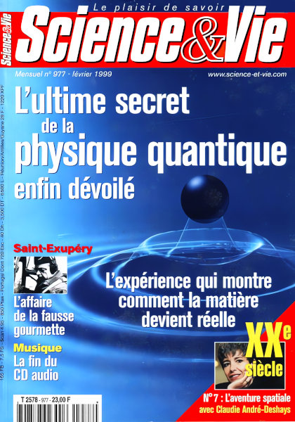 février 1999 – 180 pages• L’évènement : OGM : l’Europe tranchera • Forum ACTUALITÉ • Image du mois • Recherche • Environnement • Technologie • Médecine EN COUVERTURE • Découverte : Comment la matière devient réelle DÉCOUVERTES • COSMOLOGIE : Ces cordes qui ont orchestré l’Univers • ASTRONOMIE : Stardust à la poursuite de la comète • ASTRONAUTIQUE : Une seconde lune dans le ciel de France • GÉOPHYSIQUE : La Terre est une dynamo • GÉNÉTIQUE : Main basse sur le génome humain • NEUROLOGIE : Le cerveau a-t-il un sexe ? • ZOOLOGIE : L’invasion du fossile vivant • REPORTAGE : Mauritanie, le peuple qui veut sauver sa pêche • ENQUÊTE : Saint-Exupéry, la bonne affaire de la gourmette • ÉNERGIE : Le second souffle d’Éole PL@NET • Actualité du multimédia • Virtuellement humain. • Internet • CD-Rom • Conso SCIENCE-FICTION • Il était le fils de son frère CONSO • Actualité • Le disque compact est-il condamné ? ENCYCLOPÉDIE XXE SIÈCLE • L’aventure spatiale – La guerre des étoiles – Triompher de la pesanteur – CLAUDIE ANDRÉ-DESHAYS : « Le désir d’aller toujours plus loin » LOISIRS • RÉTRO : Il y a 45 ans • Le ciel du mois • Livres • Index des numéros 964 à 975 pour l’année 1998 |