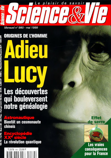 mai 1999 – 184 pages• L’évènement : L’Aventure continue • Forum ACTUALITÉ • Recherche • Environnement • Technologie • Médecine • EN COUVERTURE : Adieu Lucy : Les découvertes qui bouleversent notre généalogie • ASTRONOMIE : LE PETIT JOURNAL DE L’ÉCLIPSE (II) La science des éclipses • PHYSIQUE : L’Univers a-t-il pu se créer tout seul ? • GÉNÉTIQUE : L’île du Dr Stefansson • BOTANIQUE : Les « cinq sens » des plantes • DOSSIER : La France sous l’effet de serre – Les temps changent – Bulletin météo pour 2060 – Avis de tempêtes • AÉROSTATION : Breitling Orbiter 3 : le triomphe de la météorologie • EPISTÉMOLOGIE : L’homme qui a dévoilé le système nerveux • NEUROLOGIE : Un court-circuit dans le cerveau • MÉTALLURGIE : Processeurs : enfin l’âge du cuivre • ASTRONAUTIQUE : Un Chinois dans l’espace PL@NET • Actualité du multimédia • L’internet polymorphe • Pollutions en ligne • Conso • La nouvelle révolution du livre ENCYCLOPÉDIE XXE SIÈCLE • La révolution quantique – L’infiniment petit bouleverse le monde – Les nouveaux commandements – ALAIN ASPECT : « Des codes secrets protégés par les lois de la nature » LOISIRS • Rétro • Le ciel du mois • CD-Rom • Livres |