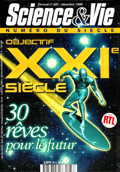 décembre 1999 – 220 pages• L’évènement : L’année du Futur • Forum ACTUALITÉ • Recherche • Environnement • Technologie • Médecine • ENQUÊTE : Champagne : tradition et haute technologie • CARTOGRAPHIE : Le monde plus vrai que nature • INFORMATIQUE : Faut-il avoir peur du grand bogue ? PL@NET • Actualité du multimédia • Internet : zoo planétaire • CONSO • Noël high-tech ENCYCLOPÉDIE XXE SIÈCLE • La communication globale – La naissance de l’internet – Une architecture planétaire – PHILIPPE QUÉAU : « Un réseau au service de milliards d’humains » LOISIRS • Rétro • Le ciel du mois • CD-Rom • Livres EN COUVERTURE • Objectif XXIe siècle : 30 rêves pour le futur • Éditorial • Rêves de savoir • Rêves de puissance • Rêves de nouveaux horizons • Rêves de bien-être • Perspectives • SONDAGE EXCLUSIF : Qu’est-ce qui fait rêver les Français ? |