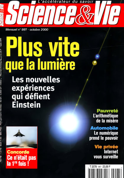 octobre 2000 – 196 pages• L’évènement : L’avenir des clones • Forum ACTUALITÉ • Recherche • Environnement • Technologie • Médecine • DOCUMENT : Concorde : ce n’était pas la première fois ! • EN COUVERTURE : Plus vite que la lumière – Les nouvelles expériences qui défient Einstein – Petit tour d’horizon des illusions lumineuses – Tout est relatif • BIODIVERSITÉ : Des îles habitées sous la mer • CLIMATOLOGIE : Oscillation nord-atlantique : le Yo-Yo météo • ENQUÊTE : Koursk : Tombé sous les armes russes • SOCIO-ÉCONOMIE : L’arithmétique de la misère • DOSSIER : Satellites : La guerre des images • ARCHÉOLOGIE : Les secrets de la tombe d’un prince saka • PHYSIQUE : En route pour Photoniqueville • AUTOMOBILE : Le numérique prend le pouvoir • HISTOIRE : Pierre Varignon, l’inventeur de la vitesse SCIENCE NET • Vers l’internet tout optique INTERNET • Un œil sur l’orbite CONSO • Internet : la menace • Le Mac à la puissance Cube LOISIRS • Rétro • Le ciel du mois • CD-Rom • Livres |