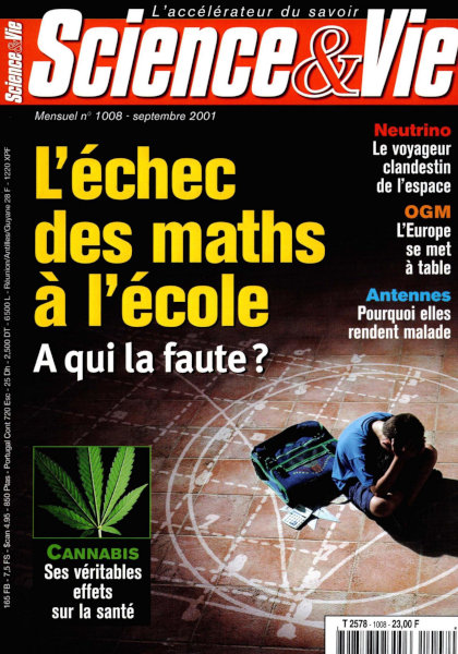 septembre 2001 – 172 pages• L’évènement : OGM, le fait accompli • Forum ACTUALITÉ • Recherche • Environnement • Technologie • Médecine • EN COUVERTURE : L’échec des maths à l’école • PHYSIQUE : Neutrino, la particule transformiste • ZOOLOGIE : Beautés fatales • SYSTÉMATIQUE : Les chasseurs du vivant, une espèce en voie d’extinction • BIOTECHNOLOGIE : OGM, l’Europe se met à table • ENQUÊTE : Antennes-relais, pourquoi rendent-elles malade ? • ÉCOLOGIE : Rhin-Rhône, rives à la dérive • STATISTIQUES : Délinquance, faut-il croire les chiffres ? • TECHNOLOGIE : Le planeur des mers • ARCHÉOLOGIE : Les monuments aux morts gaulois • FOCUS : Cannabis, ses véritables effets sur la santé • AÉRONAUTIQUE : Concorde regonflé • ÉNERGIE : Éoliennes, le vent tourne • MÉDECINE : L’échographie au bout du fil SCIENCE NET • L’œil rivé sur le web INTERNET • Médicaments sous surveillance CONSO • Révolution à portée de main ! • Surfer en plein ciel LOISIRS • Le ciel du mois • CD-Rom • Livres • HISTOIRE : Foucault, la preuve par le pendule • RÉTRO : Il y a 55 ans |