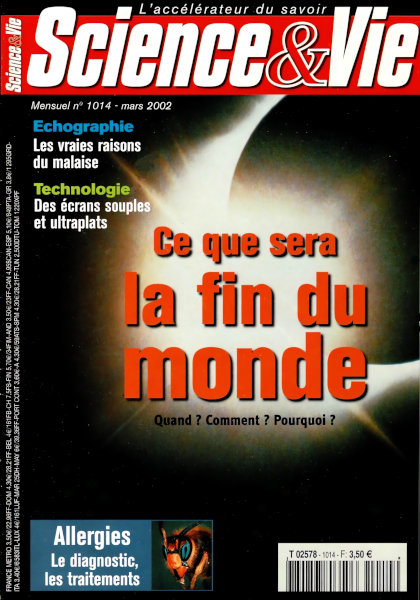mars 2002 – 168 pages• L’évènement : Notre lecteur dans l’espace • Forum • Les pyramides ACTUALITÉ • Recherche • Environnement • Technologie • Médecine • EN COUVERTURE : Ce que sera la fin du monde : Quand, comment, pourquoi – La fin de la vie sur Terre – La fin du Système Solaire – L‘Univers sans fin – Histoire d’un mythe • MÉDECINE : Une éponge contre le diabète • GÉOLOGIE : Falaises : attention danger ! • NEUROPSYCHOLOGIE : La pub force notre cerveau • OBSTÉTRIQUE : Échographies, la crise de confiance • DOSSIER : Fallait-il libérer les poules ? • PHYSIQUE : 1/xE la loi de l’inégalité • ÉCOLOGIE : L’énigmatique invasion des crabes géants • FOCUS : L’allergie en questions • GÉODÉSIE : Mont Blanc : Il mesure en réalité 4810,40 m ! • ÉLECTRONIQUE : Des écrans plats de 1 millimètre ! • BIOMÉTRIE : La marche livre ses secrets • AÉRONAUTIQUE : Le mur du son en douceur • ARCHÉOLOGIE : Nola : l’autre colère du Vésuve SCIENCE NET • Le créateur de planètes virtuelles INTERNET • La consécration mondiale du Net CONSO • Le montage vidéo pour tous LOISIRS • Le ciel du mois • CD-Rom • Livres • HISTOIRE : Poincaré, la science et la conscience • RÉTRO : Il y a 25 ans |