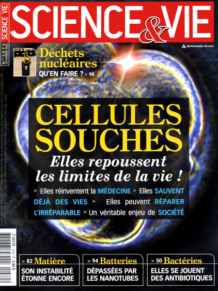 novembre 2006 – 152 pages• Avant-propos : Dans le secret des dieux • FORUM : Réactions, critiques, remarques… nos lecteurs prennent la plume • ILS L’ONT FAIT : Retour en image sur les derniers événements scientifiques ACTUALITÉS • EN DIRECT DES LABOS : Les neurones longs sortent de l’ombre – Une enfant australopithèque dormait tout près de Lucy – La soie de la tarentule sort de ses pattes – etc. • PLANÈTE TERRE : L’appétit pour la viande pèse sur l’environnement – Le printemps est plus précoce – etc. • SANTÉ : un vaccin s’attaque aux mélanomes – Le palmarès des aliments les plus sains – etc. • L’AGENDA DES SCIENCES : Tous les grands rendez-vous scientifiques de novembre • LES CLÉS POUR COMPRENDRE : Résistance aux antibiotiques : l’état d’urgence À LA UNE : Cellules souches : la révolution en marche FONDAMENTAL • PLANÈTES : Deux planètes ont été repérées… sans la moindre étoile alentour. • NOYAUX MAGIQUES : On le croyait stable… Il est en fait fragile • MOMIFICATION : L’analyse inédite de la momie de Toulouse révèle que les Égyptiens savaient déjà embaumer il y a… 4 000 ans • NANOTUBES : Rechargeables en quelques secondes, quasi inusables… Les ultracondensateurs ont tout pour supplanter les batteries ! EXPLORATIONS • TABLE RONDE : Que faire des déchets nucléaires ? • ANALYSE : Le singe, l’homme et les savants EN PRATIQUE • À LIRE, À VOIR : Tout sur les livres, expositions, films, sites web, etc., de l’actualité des sciences. Et toujours « le Ciel du mois » • Q & R : Quelle est l’action des désherbants dits « sélectifs » ? – Comment se fait-il que notre système solaire soit plat ? – Pourquoi, sortis du frigo, les glaçons collent-ils aux doigts ? • LE POINT SUR… le contrôle aérien • TECHNOFOLIES : L’œuf à la cuisson scientifique – Le globe en lévitation… • TEST : Feriez-vous un bon policier scientifique ? |