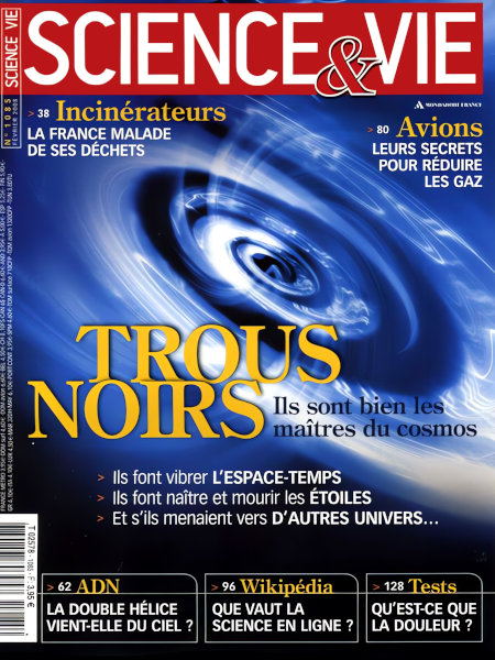 février 2008 – 144 pages• Avant-propos : Troublants trous noirs • FORUM : Réactions, critiques, remarques… nos lecteurs prennent la plume • ILS L’ONT FAIT : Retour en image sur les derniers événements scientifiques ACTUALITÉS • EN DIRECT DES LABOS : Des cellules se cachent pour mourir – La couronne solaire livre enfin ses secrets – etc. • PLANÈTE TERRE : L’Europe est leader contre le réchauffement – Un ver décime les pandas géants – etc. • SANTÉ : Le mobile serait bien source de tumeurs – Le soja protègerait les femmes – Le brocoli pourrait traiter une maladie de peau rare – etc. • L’AGENDA DES SCIENCES : Les grands rendez-vous scientifiques de février • LES CLÉS POUR COMPRENDRE : La France brûle-t-elle trop de déchets ? À LA UNE : Trous noirs FONDAMENTAL • FORME DE L’ADN : Et si la forme de l’ADN venait de l’espace ? • ANTIMATIÈRE : Deux physiciens ont fabriqué une molécule constituée de matière et d’antimatière ! • IMMUNITÉ : Un système immunitaire primitif découvert chez l’amibe le montre : nos défenses nous ont précédés • AVIONS : Prix du pétrole et préoccupations écologiques poussent les avions à réduire les gaz EXPLORATIONS • REPORTAGE : Sur la piste des télescopes géants • ENQUÊTE : Wikipédia, la science en ligne est-elle fiable ? EN PRATIQUE • À LIRE, À VOIR : Tous les livres, expositions, films, sites web, etc., de l’actualité des sciences. Et toujours « le Ciel du mois » • Q & R : Pourquoi la génétique conteste-t-elle l’idée de race ? – Est-on capable de fabriquer du sang artificiel ?… • LE POINT SUR… la radiothérapie • TECHNOFOLIES : Le véhicule urbain qui asseoit le pilotage – La guitare qui s’accorde toute seule – La station multimédia transportable… • TEST : Que savez-vous de la douleur ? • Index des numéros 1072 à 1083 pour l’année 2007 |