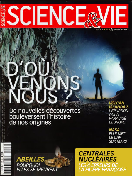 juin 2010 – 152 pages• Avant-propos : Un Homme à réinventer • FORUM : Réactions, critiques, remarques… nos lecteurs prennent la plume • ILS L’ONT FAIT : Retour en image sur les derniers événements scientifiques ACTUALITÉS • L’ÉVÈNEMENT : Comment l’éruption de l’Eyjafjöll a-t-elle pu paralyser l’Europe ? • EN DIRECT DES LABOS : Les Japonais sont parés pour digérer les makis – etc. • GROS PLAN : Le site pour installer le plus grand télescope du monde a été choisi • PLANÈTE TERRE : • ENVIRONNEMENT :Les tortues sont des victimes collatérales de la pêche – etc. • MÉDECINE : L’idée qu’un virus de plante puisse nous infecter resurgit – Portable : l’étude interphone est enfin parue – etc. • TECHNOS : L’avion zéro carburant a réussi son premier vol – etc. À LA UNE : D’où venons-nous ? VIE D’AUJOURD’HUI • ESPACE : La NASA met le cap sur Mars • NUCLÉAIRE : Les 4 erreurs de l’EPR FONDAMENTAL • HAYABUSA : L’incroyable retour de la sonde prodigue • ADN : Les physiciens en font un matériau de construction • DINOSAURES : Leurs couleurs d’origine ressuscitées EN PRATIQUE • Q & R : Est-il vrai qu’un séisme peut modifier la rotation de la Terre ? – Pourquoi respirer de l’hélium modifie-t-il la voix ? – Un gaz peut-il se solidifier ? • LE POINT SUR… la prothèse auditive • TECHNOFOLIES : Un vidéoprojecteur qui la joue en relief – Des lunettes « actives » quasi universelles – Une guitare totalement synthétique – etc. • À LIRE / À VOIR / .NET : Tout sur les livres, expositions, films, sites web, etc., de l’actualité des sciences. Et toujours « le Ciel du mois » • NOS 3 QUESTIONS À… Franz de Waal |