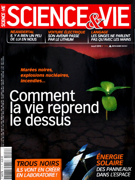 juillet 2010 – 140 pages• Avant-propos : Le vivant, toujours plus fort ? • FORUM : Réactions, critiques, remarques… nos lecteurs prennent la plume • ILS L’ONT FAIT : Retour en image sur les derniers événements scientifiques ACTUALITÉS • EN DIRECT DES LABOS : Herschel a photographié des étoiles en train de naître – Le rôle des astrocytes est-il surestimé ? – etc. • L’EXPLOIT : Ils ont trouvé du Neandertal en nous • PLANÈTE TERRE : • ENVIRONNEMENT : Un lézard sur cinq pourrait disparaître d’ici à 2080 – La fonte des glaces soulève le Groenland – etc. • MÉDECINE : Dans l’Alzheimer, la musique aide à retrouver ses mots – On a compris le mécanisme de l’emphysème du fumeur – etc. • TECHNOS :Un nanorobot marche sur les traces de l’ADN – etc. À LA UNE : Comment la vie reprend le dessus VIE D’AUJOURD’HUI • L’AVENIR DE LA VOITURE ÉLECTRIQUE : Doté d’étonnantes propriétés, le lithium est devenu incontournable dans les batteries électriques • LE DÉFI FOU DU SOLAIRE SPATIAL : En orbite géostationnaire, une centrale solaire à micro-ondes ou à laser produirait l’équivalent en électricité d’un réacteur nucléaire FONDAMENTAL • LANGAGE : Des singes relancent le débat sur son origine • TROUS NOIRS : Ils les recréent en laboratoire • MÉMOIRE : Il est possible de la reprogrammer artificiellement EN PRATIQUE • Q & R : L’interdit de l’inceste a-t-il un fondement biologique ? – Qu’est-ce qui provoque les courants océaniques ? – Comment de l’ADN peut-il encore se trouver dans des fossiles ? – etc. • LE POINT SUR… les feux d’artifice • TECHNOFOLIES : Les premiers panneaux solaires colorés à haut rendement – Des palmes qui n’empêchent pas de marcher – etc. • À LIRE / À VOIR / .NET : Tout sur les livres, expositions, films, sites web, etc., de l’actualité des sciences. Et toujours « le Ciel du mois » • NOS 3 QUESTIONS À… Marc Fontecave |