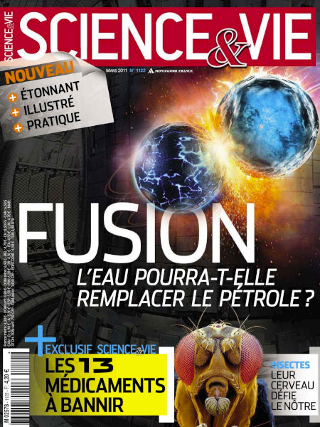 mars 2011 – 144 pages• Avant-propos : Mediator – Fusion nucléaire – Science & Vie • FORUM ACTUS • Labos : La couronne solaire livre ses premiers secrets – Voici un nouvel aïeul des dinosaures carnivores – etc. • IDÉE NEUVE : « On peut trouver une vie extraterrestre autrement » • Terre : L’agriculture rejette plus de carbone sous les tropiques – En Australie, les eaux usées deviennent potables – etc. • FOCUS : Pollution lumineuse : elle empêche l’air de se purifier • ON EN REPARLE : Le golfe du Mexique respire… • Médecine : Les antioxydants accélèrent le vieillissement – Une nouvelle technique contre les acouphènes – etc. • LES CLÉS POUR COMPRENDRE : Pourquoi la rougeole fait un inquiétant retour en force • Technos : Un laser mieux que le laser – Le canon électromagnétique passe l’épreuve du feu – Devenir indétectable sous l’eau est possible – etc. • ON TENAIT À VOUS LE DIRE : La Chine n’a pas volé ses terres rares FONDAMENTAL • À LA UNE : Fusion : L’eau pourra-t-elle remplacer le pétrole ? • CASSE-TÊTE : L’intelligence des insectes défie la nôtre • DÉBAT : Le temps va-t-il s’arrêter dans 3,5 milliards d’années ? • AVANT-PREMIÈRE : Volcans : ils ne frapperont plus par surprise • EXPLOIT : Angkor : Le plus grand puzzle du monde reconstitué • TENDANCE : Objectif : récupérer l’énergie du quotidien • LE POINT SUR… C’était il y a 15 ans : la crise de la vache folle EN PRATIQUE • BON À SAVOIR • ÇA CHANGE QUOI ? Au-delà du Mediator, les 13 médicaments à bannir • QUESTIONS RÉPONSES : Comment un « coupe-faim » comme le Mediator peut-il dérégler le cœur ? – Manger moins de viande est-il vraiment bon pour la planète ? – Pourquoi ferme-t-on les yeux quand on éternue ? – Connaissons-nous l’ancêtre commun des insectes ? – Un satellite peut-il avoir un satellite ? • TECHNOFOLIES : La première console 3D sans lunettes – Un web-tensiomètre pilotable par smartphone – etc. • À FAIRE : Prélevez vous-même votre ADN • LE CIEL DU MOIS |